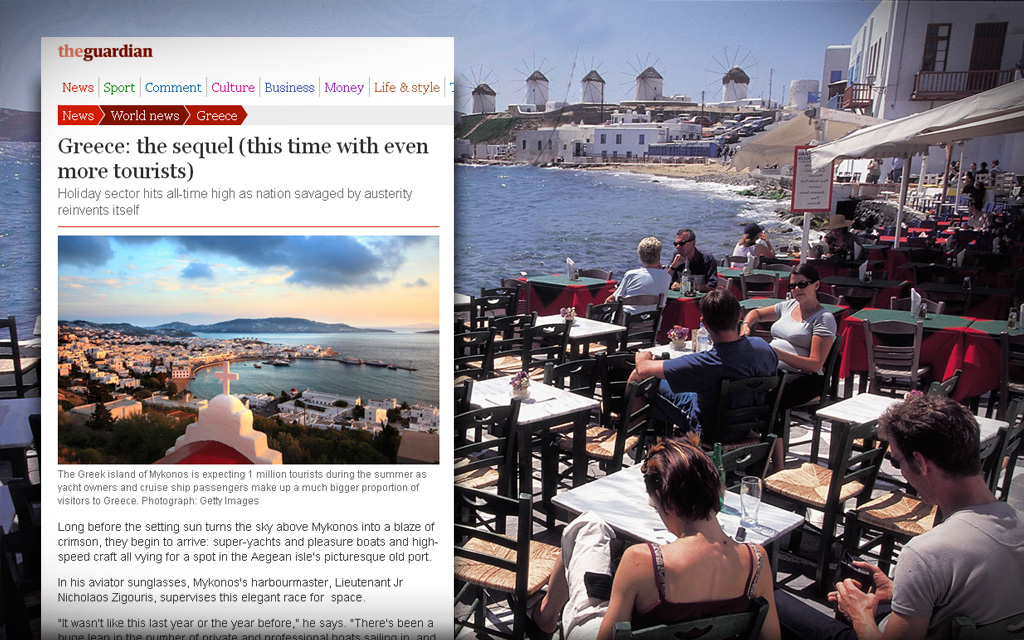 Интересное посвящение греческому Миконосу сделала британская газета «Гардиан», утверждая, что экономический кризис заметно улучшил качество обслуживания туристов в Греции, и что «эпоха шашлыков и грека Зорба» закончилась!