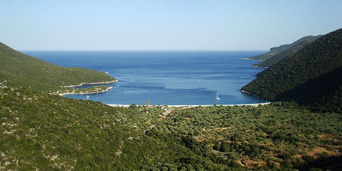 Пляж: Идеальная полукруглая бухта с кристально чистой, бирюзовой водой, с большой белой галькой и с несколькими зелеными холмами, которые "закрывают" ее по краям.
