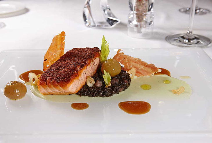 В отмеченном наградами ресторане Alfredo's Grand Dining казино Regency Thessaloniki шеф-повар Апостолос Альтанис подготовил уникальное меню, состоящее из шести изысканных блюд: пармезан с копченым морским гребешком, перуанский картофель и красное яблоко, тартар из тунца с авокадо и кремом из авокадо, блюда из свеклы и пармезана, сорбет из маракуйи и желе из шампанского, молочная тернер с пюре из сладкого картофеля и соусом марсала, шоколадный дуэт с жемчугом из белого шоколада и мороженым винсанто и, наконец, кофе или чай.