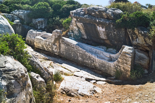 Доказательства былых эпох на краю острова говорят о мощи великих святилищ (храм Диониса в "Ирия", храма Аполлона в "Палатья", святилище Деметры в «Гируле»). Кроме того, воображение поражают недостроенные архаические статуи колоссальных размеров – курии и кори (парни и девушки). Курии - один из двух типов могильных статуй древних времен, изображающих обнаженных юношей, богов, героев или простолюдинов. Основные характеристики: строгая фронтальная поза, видимая левая нога (обычно) и "архаичная" улыбка.