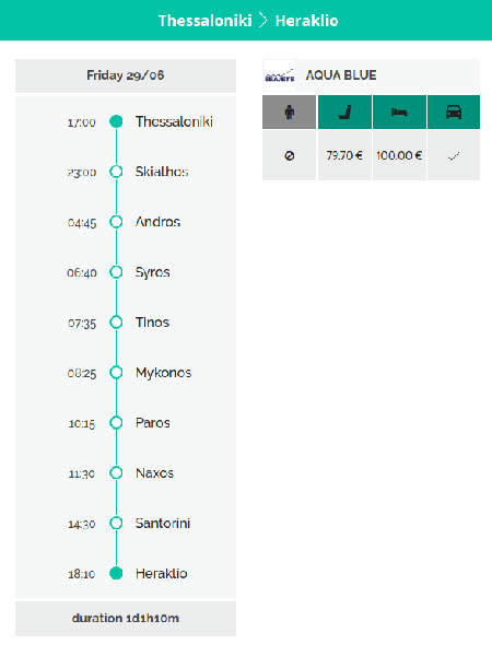 29 июня паром компании Aqua Blue отправляется в свой первый многочасовой рейс из города Салоники на острова архипелагов Спорады и Киклады, а также на самый большой остров Греции – Крит.