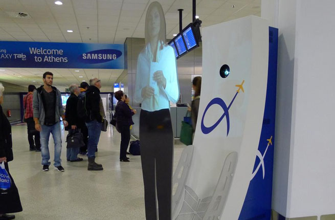 Греческий столичный аэропорт перенял технологию у аэропортов Парижа и Нью-Йорка, где заботу об информировании пассажиров взяла на себя безупречная технология. Так, приятный сюрприз ожидает всех прибывающих в Международный Афинский Аэропорт «Эль Венизелос», где их встречает красивая и улыбчивая гречанка-служащая аэропорта, предоставляющая гостям информацию о работе аэропорта. Одно плохо: красавица не настоящая, а виртуальная! Высокая смуглая девушка не морщит брови, не перестает улыбаться, обладает ангельским терпением и может повторять то, что вы не поняли с первого раза, еще и еще, не повышая голоса и не награждая вас «светскими эпитетами».